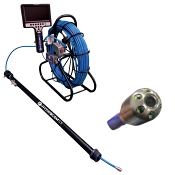 A microcâmara única permite a entrada na tubagem através de raccords de extremidade sob pressão ou caixas de limite com contador instaladas em linha. O sistema é composto por uma cabeça de câmara moldada de 14 mm, a cores e de alta resolução, com lente em safira resistente a riscos, iluminação LED branca de alta intensidade e um enrolador robusto com 50 metros de cabo flexível de 8 mm, adequado para utilização em ambiente aquático.