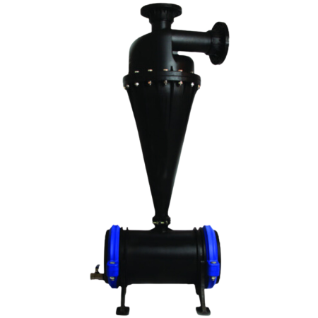 A água entra no hidrociclone através da entrada tangencial, criando um fluxo em espiral ao longo das paredes do filtro. A força centrífuga separa os detritos e as partículas de areia, empurrando-os contra as paredes do separador de areia.
