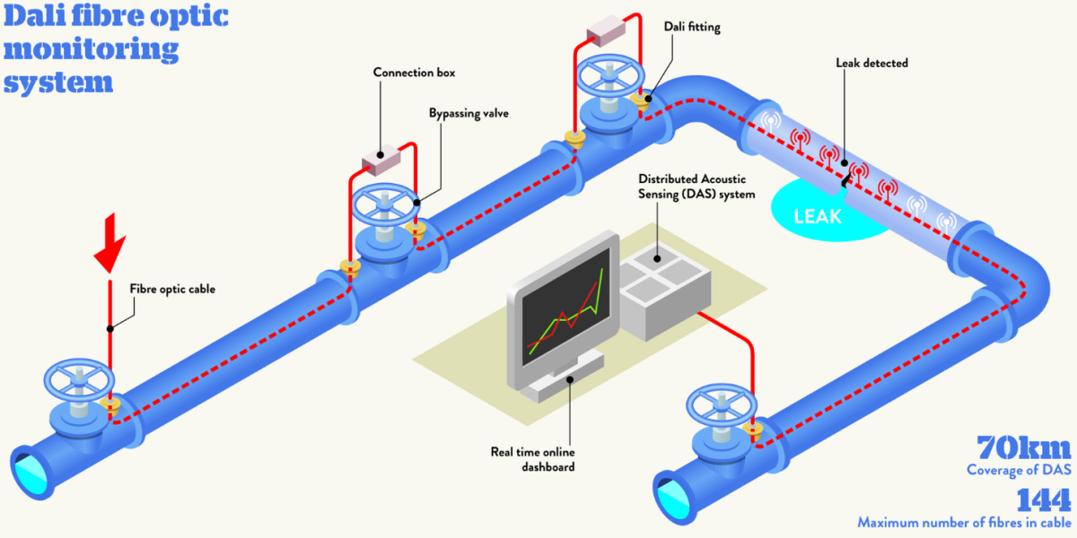 Ao contrário de outros sistemas de monitorização, DALI utiliza tecnologia de Sensorização Acústica Distribuída (Distributed Acoustic Sensing – DAS) para localizar de forma automática e com alta precisão fugas de água na rede, permitindo intervenções rápidas e uma gestão de ativos inteligente.
