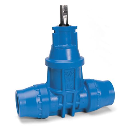 Válvula de ramal POM com tampa AVK e embocaduras auto-blocantes para tubos de PE. Para água potável e líquidos neutros.